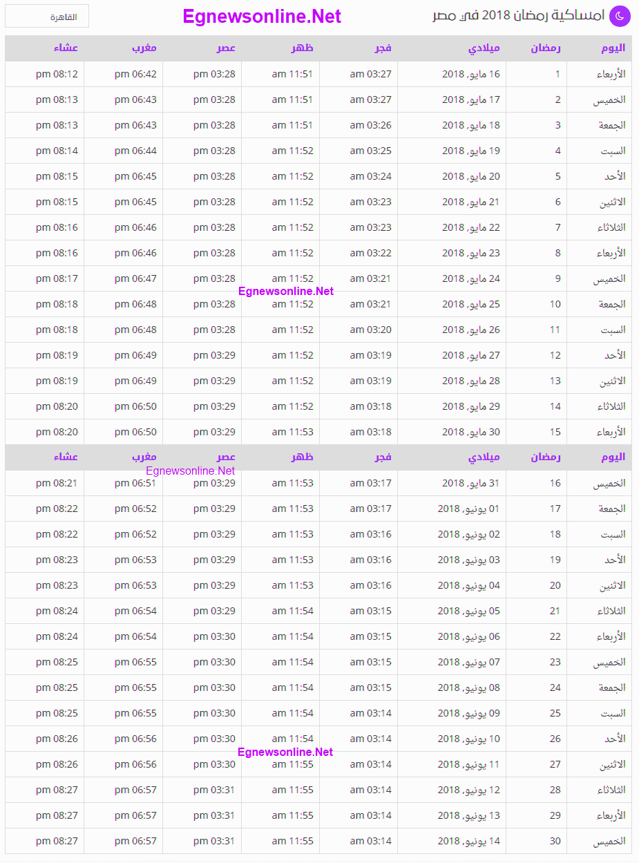 امساكية شهر رمضان 2018-1439 هــ في مصر ومواعيد الصلاة